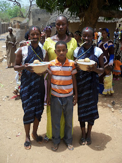 Middle school students dressed up like traditional Pulaar villagers, drawing on pretend face-tattoos (which you still see on older women sometimes), chewing on teeth-sticks, wearing blue leppi fabric outfits, and carrying traditional decorative woven discs. I gave my camera to Mamadou, my little host brother, and he took some great photos, including these ones of me sitting in the crowd (I'm still shocked sometimes by how much I really just don't blend in at all) and of my host mother Mariama (below left, you can see a snippet of her bright orange headwrap) dragging me up in front while she slipped the griot singers some change and had them sing my name in a song, which is a really nice thing to do for someone.