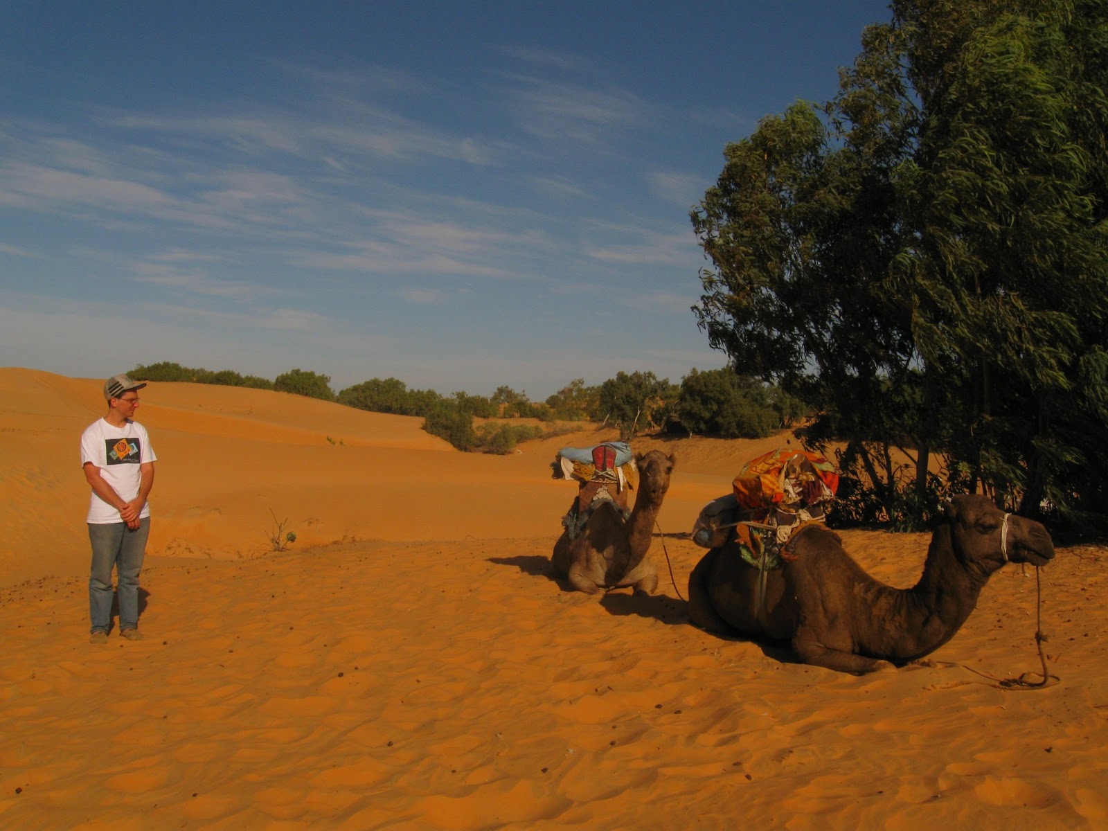 Walking along the dunes was nice, the camels plodded along, making weird, grimacing faces every once in awhile, and the crust of the sand cracked and crumbed prettily under their feet. The lovely pre-sunset sunlight, the hushed sound of sand blowing softly over sand, the rustle of leaves on the occasional tree - it was much more placid than I'd anticipated, but I liked it nonetheless.